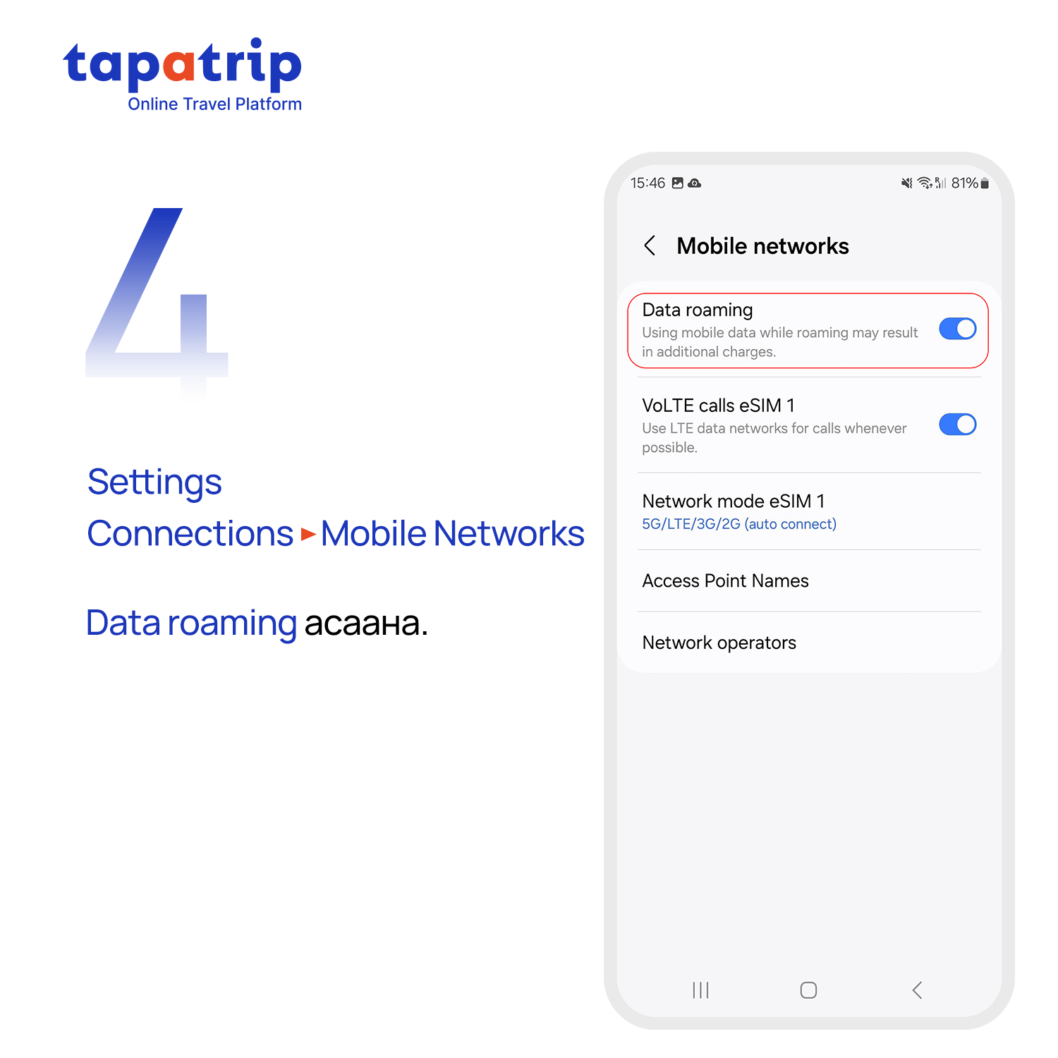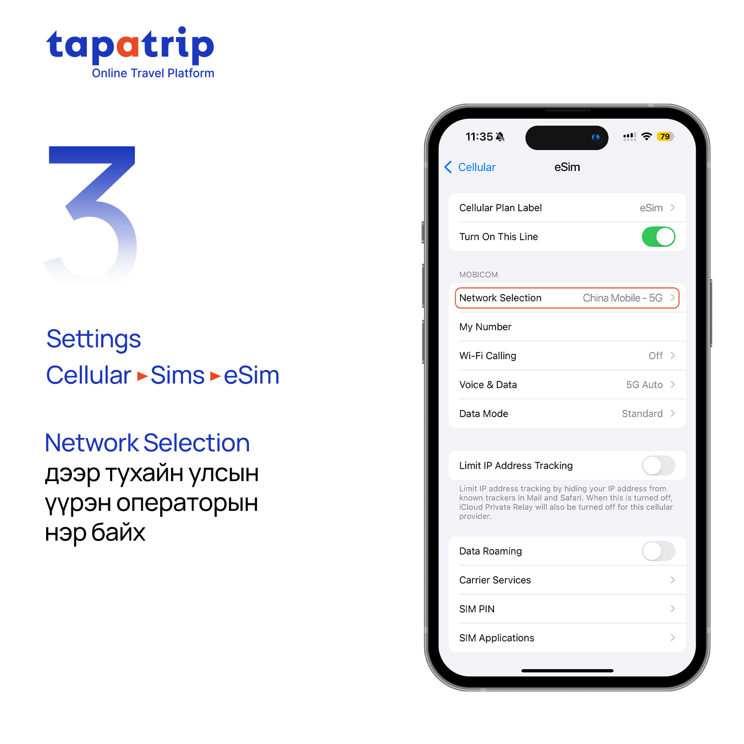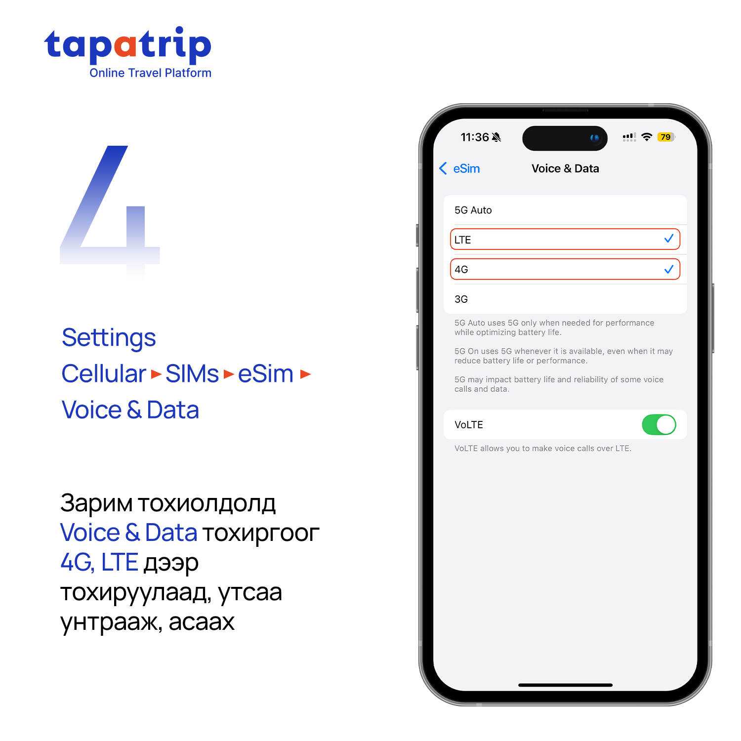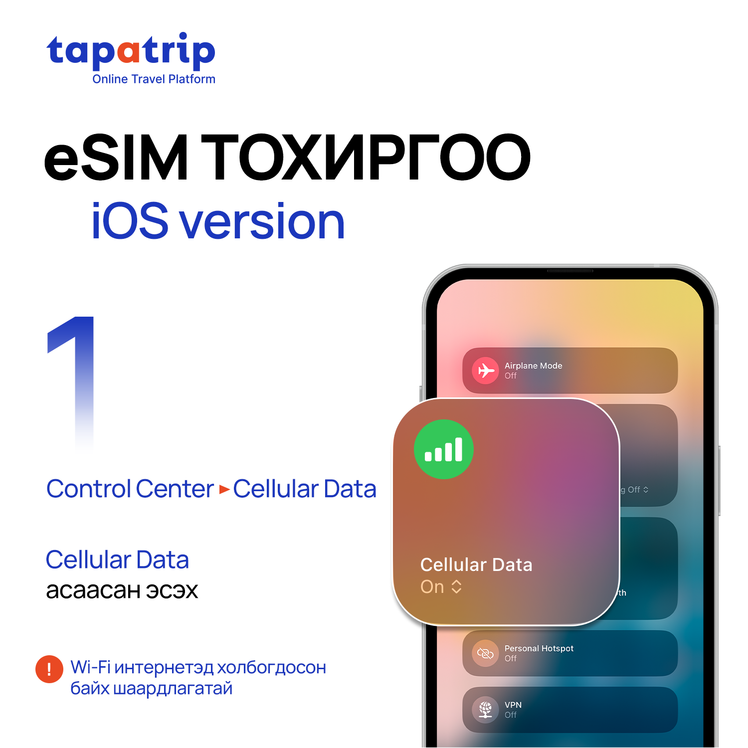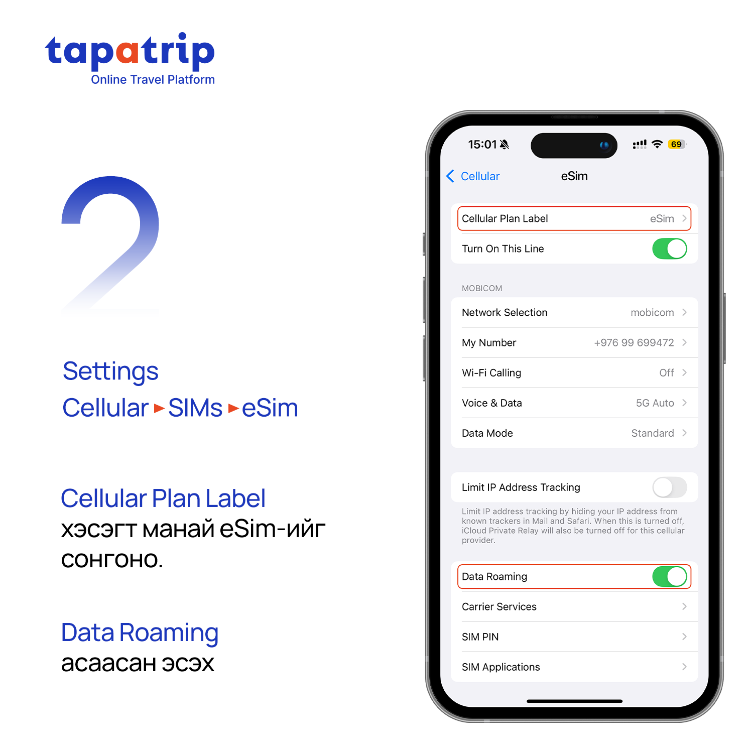 Та доорхи зааврийн дагуу eSIM суулгах бөгөөд суулгасан eSIM-нийхээ Data болон Data roaming-г нээсний (ON болгох) дараа интернэт үйлчилгээ идэвхижинэ.
